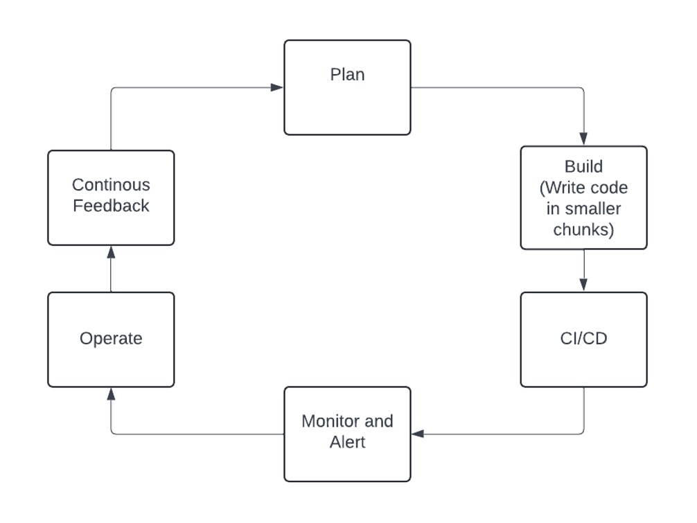 Agile is a methodology that emphasizes collaboration, customer feedback, and small, rapid releases. Instead of the traditional waterfall model, where the entire project is planned out in advance, Agile breaks the project into smaller, more manageable pieces called sprints. This allows for more flexibility and adaptability, as the project can be adjusted as needed. Each sprint ends with a review and retrospective, where the team can discuss what went well, what didn't, and what can be improved. However, Agile focuses on the flow of work and omits the operations part. That's where DevOps comes in. DevOps is the missing piece of Agile. By taking modest actions and receiving input from customers, and connecting the feedback to the development process, teams can deliver value faster and with higher quality. Below is a flowchart representing the whole process: