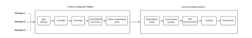 - We have developers that write code and push it to the repository. Here it is tested and built. (Unit Tests and Integration Tests).
